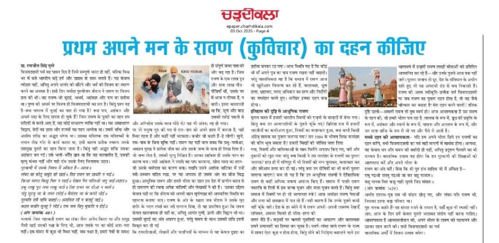 विजयादशमी—अश्विन मास के शुक्ल पक्ष की दशमी तिथि (इस वर्ष 2 अक्टूबर 2025, अर्थात 2 असू नानकशाही संवत 557)-वह पावन दिन है जिसे सम्पूर्ण भारत ही नहीं, बल्कि विश्व भर में बसे भारतीय बड़े हर्ष और उल्लास के साथ मनाते हैं। यह केवल त्योहार नहीं, अपितु अपने आनंद को बाँटने और धर्म की विजय का स्मरण करने का अवसर है।