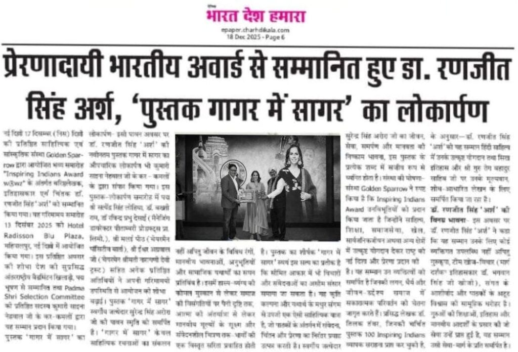 नई दिल्ली। दिल्ली की प्रतिष्ठित साहित्यिक एवं सांस्कृतिक संस्था Golden Sparrow द्वारा आयोजित भव्य समारोह “Inspiring Indians Award 2025” के अंतर्गत वरिष्ठ लेखक, इतिहासकार एवं चिंतक डॉ. रणजीत सिंह ‘अर्श’ को सम्मानित किया गया। यह गरिमामय समारोह 13 दिसंबर 2025 को Hotel Radisson Blu Plaza, महिपालपुर, नई दिल्ली में आयोजित किया गया।