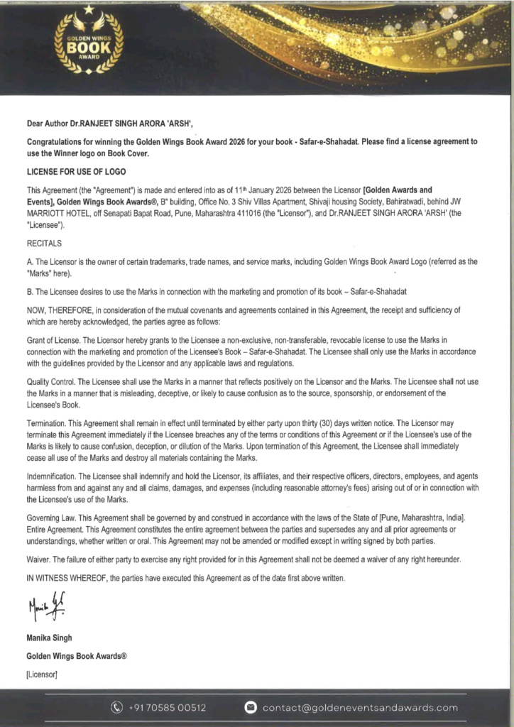 हिंदी साहित्य और ऐतिहासिक लेखन के क्षेत्र में यह अत्यंत गौरवपूर्ण समाचार है कि अर्श प्रकाशन से प्रकाशित वरिष्ठ लेखक, इतिहासकार एवं चिंतक डॉ. रणजीत सिंह ‘अर्श’ की चर्चित कृति ‘सफ़र – ए – शहादत’ को वर्ष 2026 के लिए प्रतिष्ठित Golden Wings Book Award से सम्मानित किया गया है। यह सम्मान लेखक की दीर्घकालीन साधना, ऐतिहासिक दृष्टि और वैचारिक प्रतिबद्धता की औपचारिक स्वीकृति के साथ – साथ उस चेतना का प्रमाण है, जिसे यह पुस्तक शब्दों के माध्यम से समाज तक पहुँचाती है।