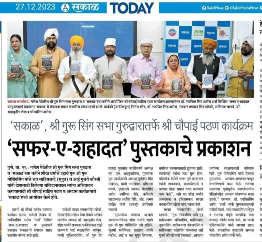 इसके अतिरिक्त, गुरुद्वारा श्री गुरु सिंह सभा, गणेश पेठ, पुणे और सकाळ मीडिया समूह के तत्वावधान में दिनांक 26 दिसंबर 2023 को सकाळ मीडिया समूह के पुणे स्थित मुख्य कार्यालय में अर्श प्रकाशन द्वारा प्रकाशित पुस्तक सफर – ए – शहादत का पुणे में लोकार्पण सकाळ अखबार के संपादक श्री सम्राट फड़णीस जी के कर – कमलों से संपन्न हुआ था| इस पुस्तक लोकार्पण के समय श्रीमती निर्मल कौर अरोरा, डॉक्टर रणजीत सिंह अरोरा ‘अर्श’, इतिहासकार सरदार भगवान सिंह जी खोजी, श्री अविनाश बागवे जी, विश्व हिंदी साहित्य सेवा संघ के अध्यक्ष डॉ शहाबुद्दीन सर, श्रीमती कुलजीत कौर गांधी, कीर्तनकार सरदार लक्खा सिंह जी एवं गुरुद्वारा श्री गुरु सिंह सभा गणेश पेठ के अध्यक्ष सरदार भोला सिंह जी अरोरा उपस्थित थे|