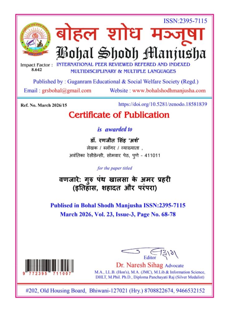 भारतीय सामाजिक-सांस्कृतिक इतिहास में वणजारा समुदाय एक विशिष्ट स्थान रखता है। यह समुदाय केवल व्यापारिक गतिविधियों तक सीमित नहीं रहा अपितु अपने संगठन, गतिशीलता, आर्थिक सामर्थ्य और सांस्कृतिक चेतना के कारण मध्यकालीन भारत की सामाजिक संरचना में अत्यंत प्रभावशाली रहा। विशेषतः सिख इतिहास में वणजारों की भूमिका केवल सहयोगात्मक नहीं अपितु संरक्षक, संवाहक और शहादत परंपरा के रूप में दृष्टिगत होती है। प्रस्तुत शोध-पत्र में ‘वणजारा’ शब्द की व्युत्पत्ति, ऐतिहासिक पृष्ठभूमि, लुबाणा संबंध, सरकारी संरक्षण तथा सिख इतिहास में उनकी विशेष भूमिका का विश्लेषण किया जा रहा है।