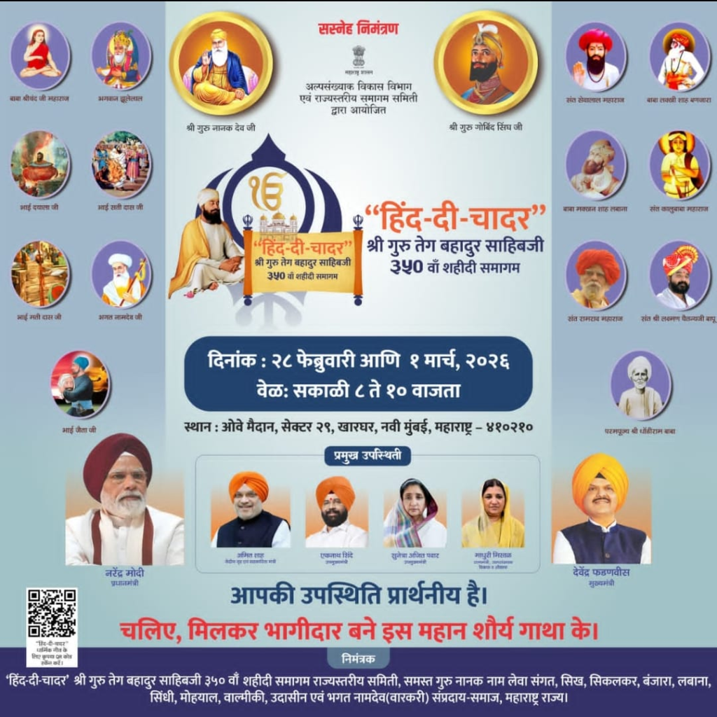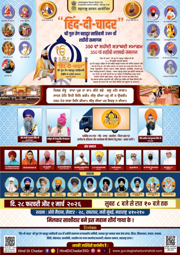 महाराष्ट्र की पुण्य भूमि, जो छत्रपति शिवाजी महाराज की पराक्रम परंपरा और संत-विचारों से संस्कारित रही है, सदैव न्याय, साहस और सर्वधर्म समभाव की भूमि रही है। ऐसे प्रदेश में 350वें शहादत स्मृति-वर्ष का आयोजन राष्ट्रीय एकता और सांस्कृतिक समन्वय का प्रतीक है। महाराष्ट्र राज्य सरकार द्वारा राज्य भर में आयोजित यह स्मरणोत्सव केवल ऐतिहासिक घटना का पुनर्स्मरण नहीं, अपितु युवा पीढ़ी के अंतःकरण में त्याग, वीरता, धार्मिक स्वतंत्रता और इंसानियत के ज़मीर की रक्षा के दिव्य मूल्यों को जागृत करने का प्रयास है।