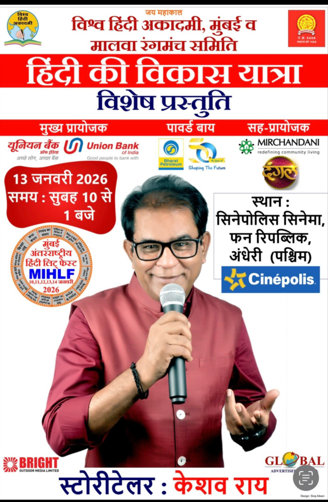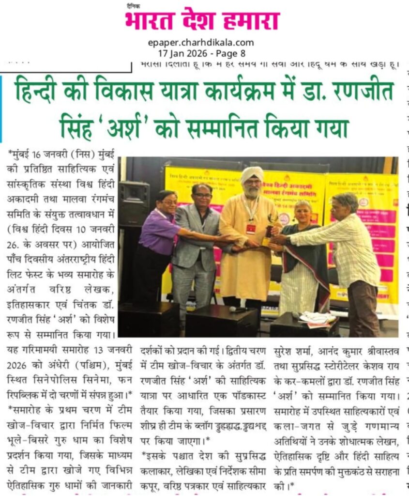 मुंबई। मुंबई की प्रतिष्ठित साहित्यिक एवं सांस्कृतिक संस्था विश्व हिंदी अकादमी तथा मालवा रंगमंच समिति के संयुक्त तत्वावधान में (विश्व हिंदी दिवस 10 जनवरी 26. के अवसर पर) आयोजित पाँच दिवसीय अंतरराष्ट्रीय हिंदी लिट फेस्ट के भव्य समारोह के अंतर्गत वरिष्ठ लेखक, इतिहासकार एवं चिंतक डॉ. रणजीत सिंह ‘अर्श’ को विशेष रूप से सम्मानित किया गया। यह गरिमामयी समारोह 13 जनवरी 2026 को अंधेरी (पश्चिम), मुंबई स्थित सिनेपोलिस सिनेमा, फन रिपब्लिक में दो चरणों में संपन्न हुआ।